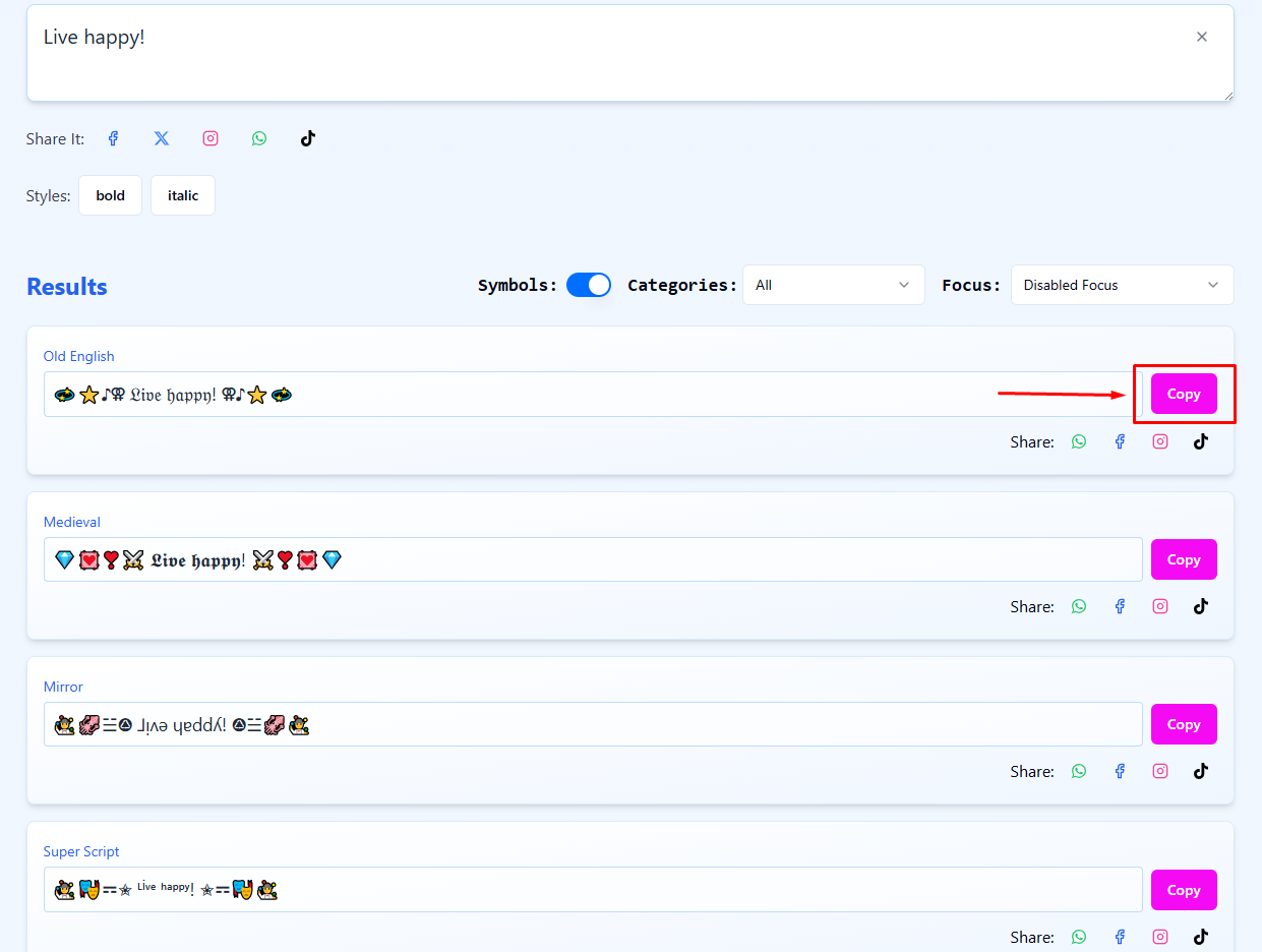 To make everything easier, we have added the option of direct social sharing on our tool. With just one click, you can share your favorite fonts on different platforms like TikTok, Instagram, WhatsApp, and Twitter.